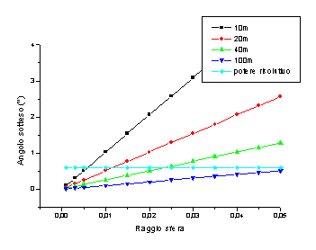 Il grafico rappresenta le condizioni sul raggio della sfera e sulla distanza dal telescopio per soddisfare la richiesta di raggi paralleli e sorgente puntiforme (telescopio di diametro 20cm) |