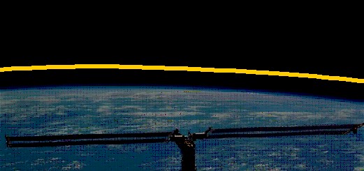Fig. 2 Pictorial composition of the International Space Station with the Earth below, where the relative altitude and thickness of Na layer and blue atmosphere at the limb are shown.