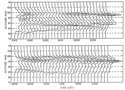 Finally, one important aspect is its dynamical behaviour, driven by the tidal effects and gravity waves . These effects, with some contribution of atmospheric turbulence, are mainly responsible for short periods evolution. The available data [1 bis] show oscillations of the Sodium layer: in particular, density and thickness oscillate in phase, while the altitude is 180 degrees out of phase. Moreover, sometimes, sporadic layers are detected with very high Sodium density and short formation time, whose origin is still not understood (Fig. 4).
