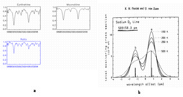· try to combine our space observations with other techniques from the ground. We plan to do this not only using data available from LIDAR routine measurements but mainly from another particular project we are in collaboration with: this is the 'Earthshine Project ' conducted at the Big Bear Solar Observatory and Caltech in California. Form this project, it is possible to derive the absorption profile of terrestrial Sodium comparing the illuminated side of the Moon with the dark side of it. Indeed, this last side can see the solar light after reflection by the Earth (Earth-shine). Since this light travels twice through the Earth's atmosphere, it is possible to derive the absorption effect of the Sodium layer provided the observations are made at high spectral resolution. Fig. 5 shows example of such spectra kindly provided by the Earthshine Project.